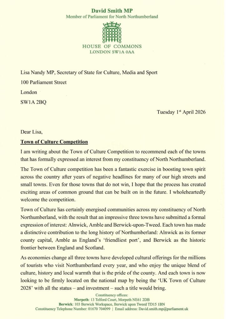 My letter to Lisa Nandy, Secretary of State for Culture, Media and Sport, urging her to consider Alnwick, Amble, and Berwick’s submissions for UK Town of Culture 2028.