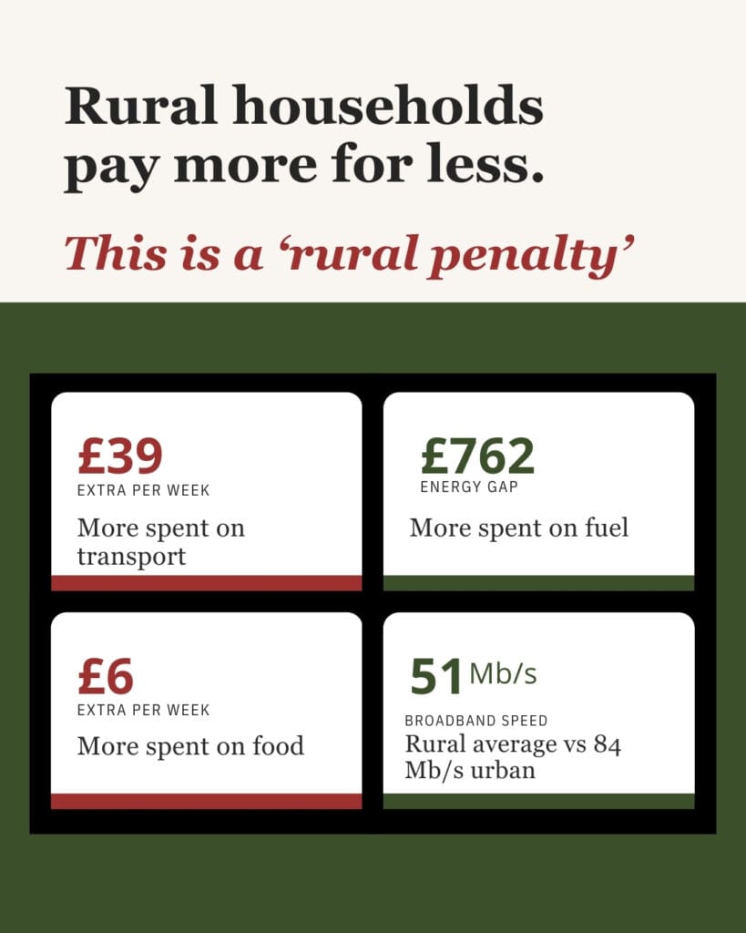 - DEFRA data shows rural households spend on average £39 more per week on transport and £6 more per week on food than their urban counterparts — adding up to thousands of pounds in additional essential spending each year.