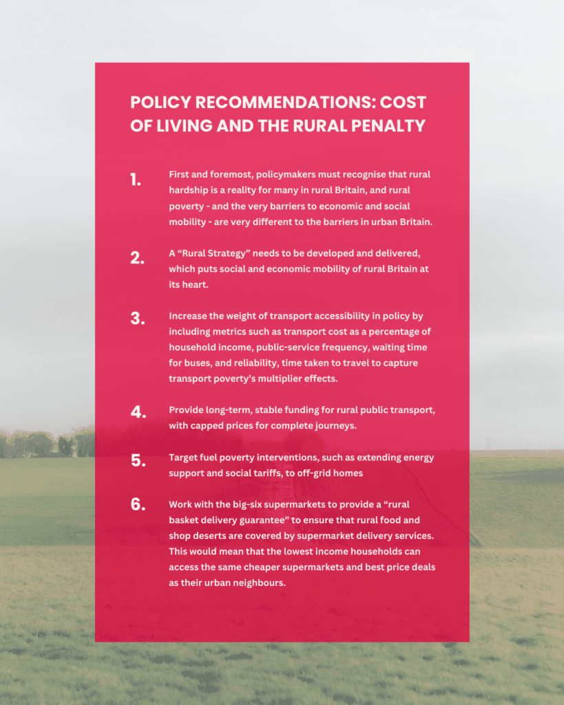 Drawing on evidence from councils, NHS bodies, charities, rural businesses and dedicated focus groups with residents, Rural Poverty in Britain finds a consistent pattern: rural households are expected to travel further, pay more and rely on fewer alternatives, yet national funding and service models continue to assume urban density, economies of scale and proximity to services.