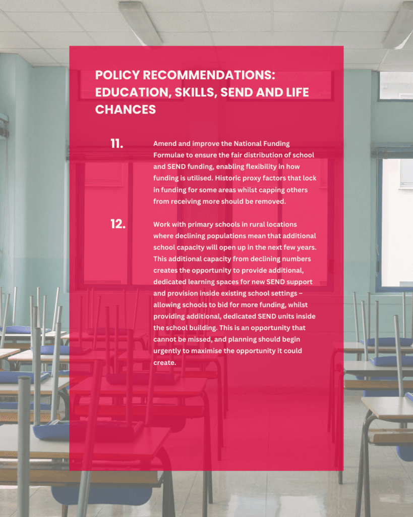 - Invest in rural SEND provision by repurposing surplus school capacity to expand specialist support within existing local schools.